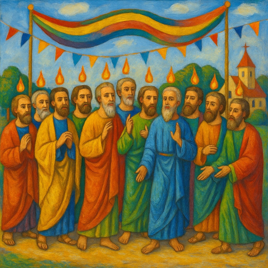 Pfingsten wird gefeiert am pfmpfzgstn (50.) Tag nach Ostern. Da versammelten sich alle 12 Apostel (Judas war kurzzeitig zu Besuch auferstanden) und wurden vom Heiligen Geist aufgesucht, der sich in feurigen Zungen auf ihren Köpfen kundtat. Und alle redeten in fremden Sprachen von den Großtaten Gottes. Keiner verstand den andren, aber jeder wusste, was der andre sagte. Das nannte man Zungenreden, und aus diesem Wunder entstand der Feiertag zur Ausgießung des Heiligen Geistes und die christliche Gemeinschaft der Pfingstbewegung. Bereits in der Apostelgeschichte entstand das Gerücht, dass das Zungenreden ein Symptom der Volltrunkeinheit sei, aber das ist nur böswillige Nachrede und Blasphemie, wie das schon Zachäus Maulbeere nach seiner Schnapspredig (im Gerstäckers Roman „Nach Amerika“, Band 2, Kapitel 6) von den Mitpassagieren im Zwischendeck erfahren hat. (Außerdem müsste der Orang-Utan in Edgar Allan Poes Kurzgeschichte „Der Mord in der Rue Morgue“, der den Zeugen nach in fremden Sprachen redete, vom Heiligen Geist befallen gewesen sein!)